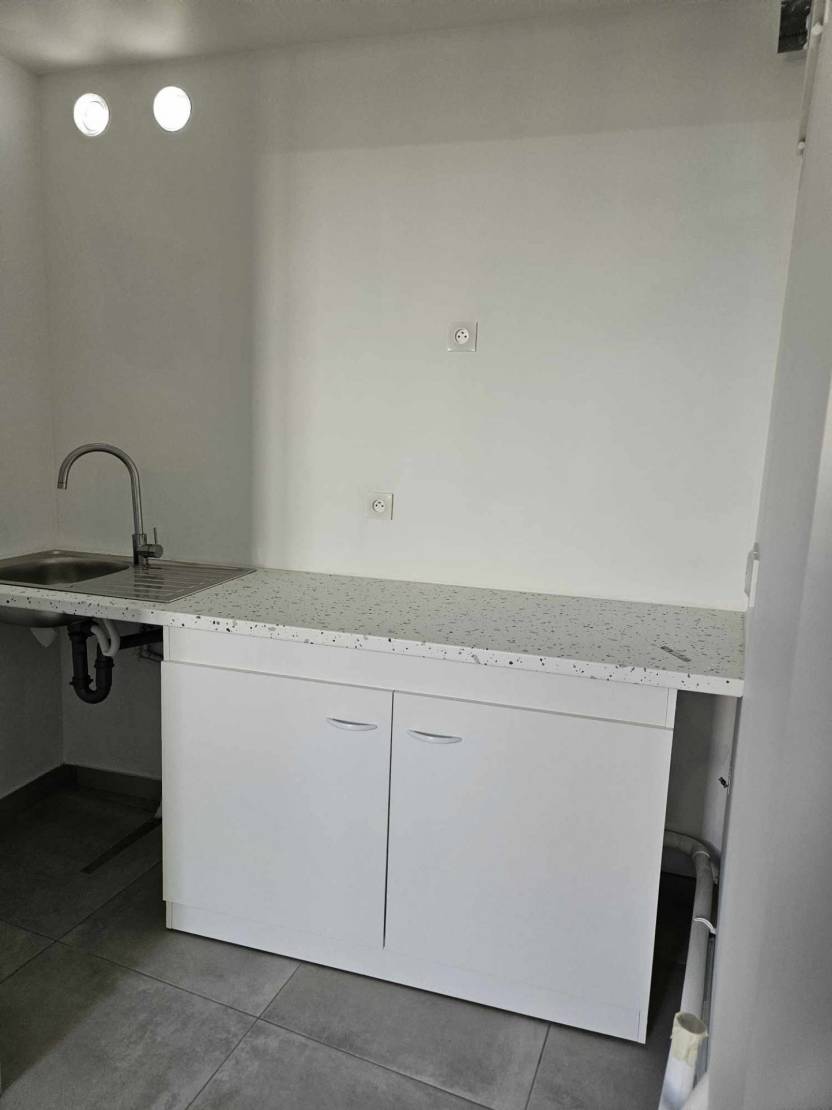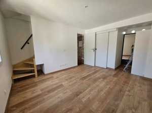 Elle se compose au rez de chaussée d'une pièce de vie ouverte sur un espace cuisine et des WC avec lave main.
