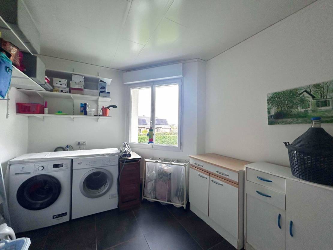 Au rez-de-chaussée vous trouverez également une chambre avec sa salle de douche, une buanderie, une suite parentale, une salle d'eau avec douche à l'italienne et double vasque, un WC et une chambre ou bureau avec l'escalier pour rejoindre le premier étage.