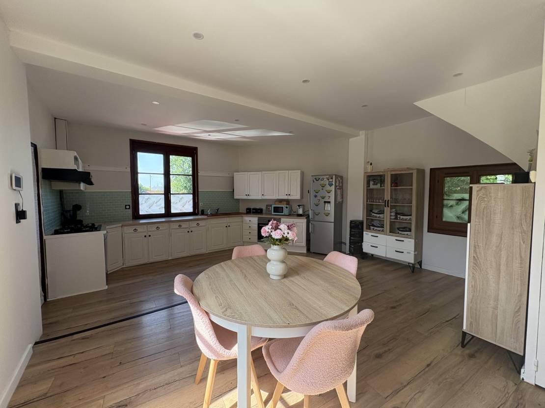 Elle offre une belle pièce de vie lumineuse et ouverte, comprenant un coin salon, une salle à manger et une cuisine aménagée.