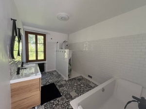 Au rez-de-chaussée, vous trouverez également une salle de bains moderne avec douche à l’italienne, baignoire, double vasque et espace buanderie, un WC séparé ainsi qu’une chambre.