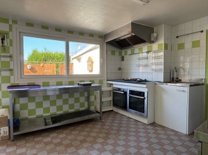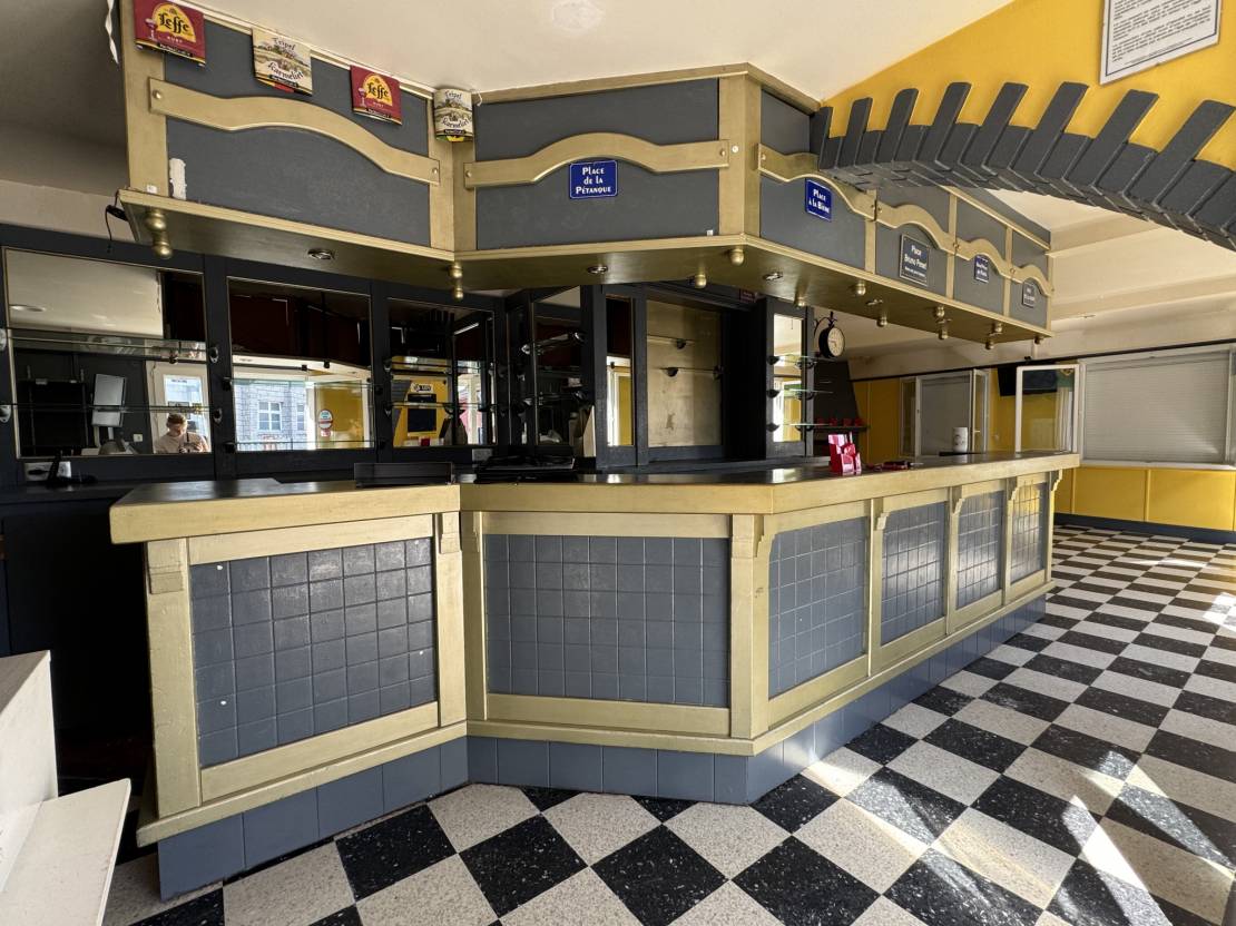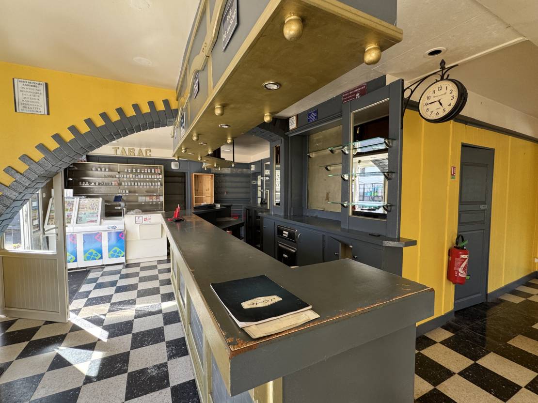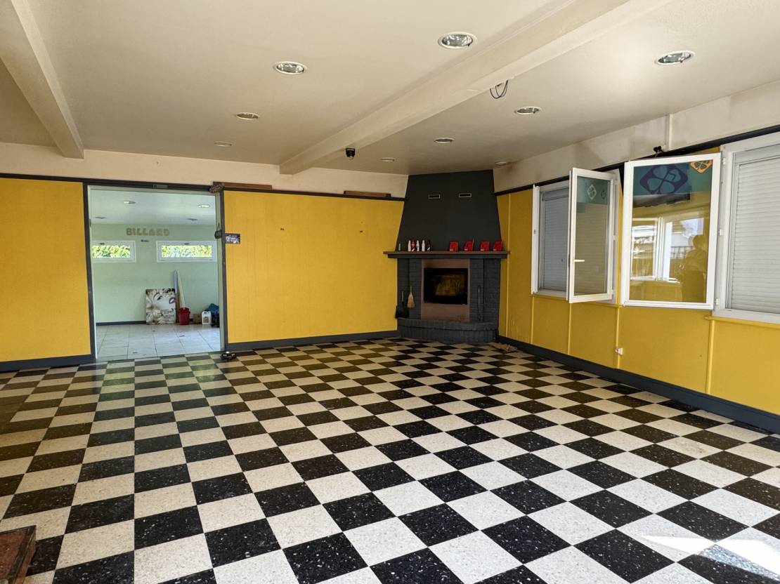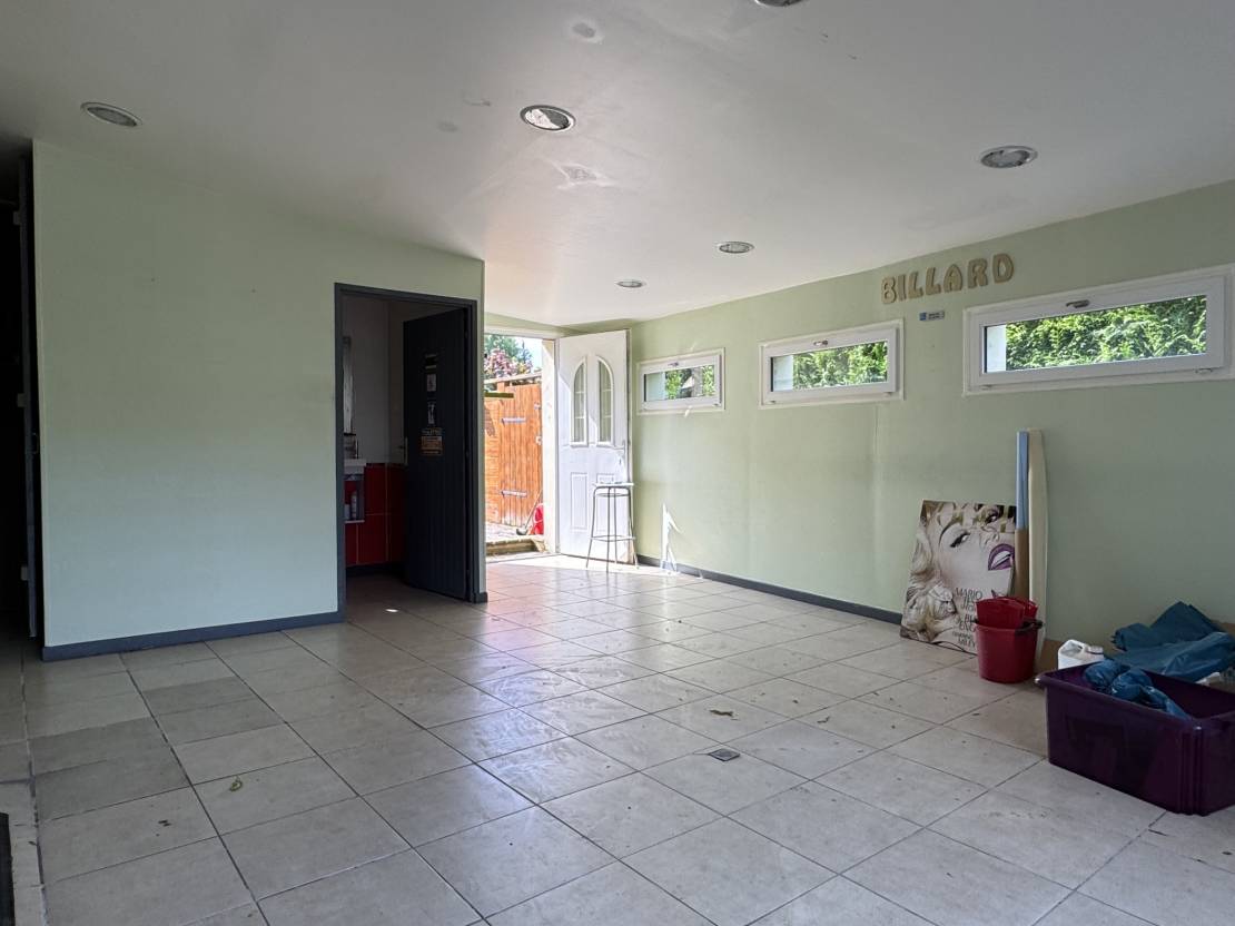Partie commerce : un espace comptoir/bar et jeux, réserve, espace réception, salle de billard, cuisine, plonge, WC avec accès PMR (personnes à mobilité réduite)